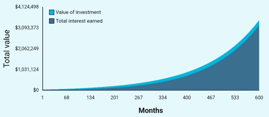 Nel grafico sotto ti mostro cosa vuol dire investire per 50 anni, inizialmente il rendimento è quasi impercettibile. Ma nel lungo periodo il tuo capitale esplode!