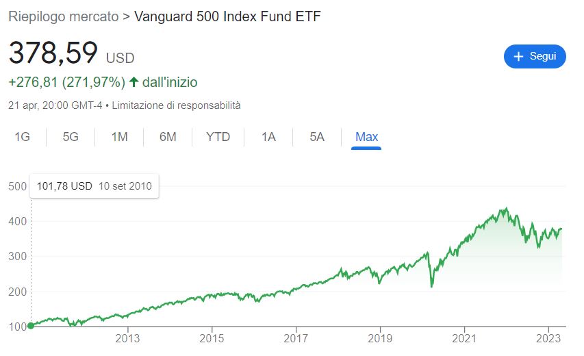 Nel secondo grafico trovi l’andamento dell’ETF Vanguard che replica l’andamento dell’indice S&P 500.